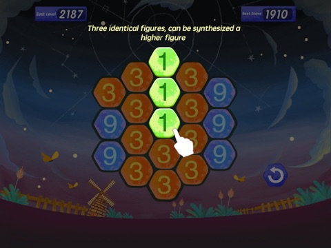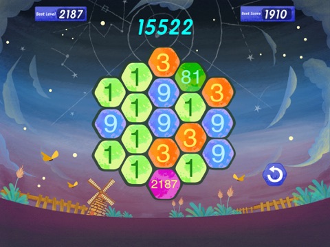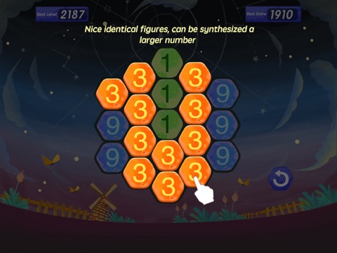 在六边形的数字格局中,不存在3个相连时游戏结束,轻按选中使3个以上相邻的合成新数字,你能合成更大的数字吗?