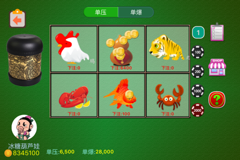 用两个骰子进行游戏,图案以鱼、虾、蟹、鸡、葫芦、老虎来取代原始骰子的六个点数。