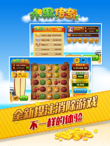 水果传奇(英文名:fruits legend)是一款极具创意的投注和消除类游戏,内包含两个游戏,分别是连环夺宝和五星水果。