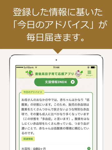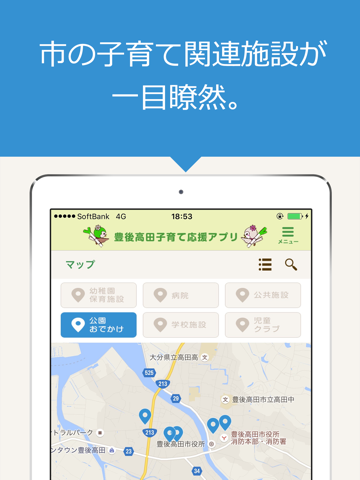 大分県豊後高田市による市内の妊娠・出産・子育て中の女性に向けた情報配信、便利ツール提供サービス。登録した利用者それぞれの状態に応じて、毎日のアドバイスが届く、お子さんの月齢に合わせて、健康診断、予防接種の事前のお知らせがプッシュ配信される、市内の病院や学校などの施設が登録されたマップなど、便利な機能が満載。さらに、Weサービス「ベビカム」と連動し、子育てブログや、ママたち同士で共感できると話題のコミュニティなどにも参加できます。