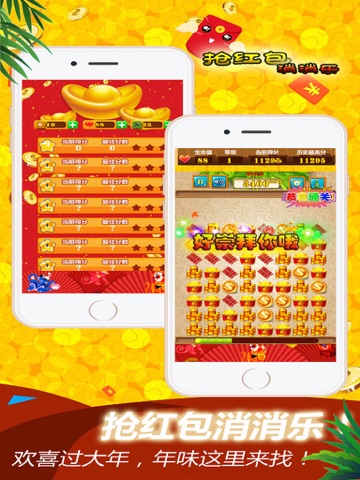 一款容易上手的休闲游戏!一旦你玩,你就不能停下来!抢红包消消乐是一个非常有趣的游戏,点击两个或多个相邻的红包过年元素就可消除并获取积分,同时有着酷炫的游戏界面和效果!
