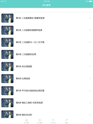 秉承着学得开心,学得有趣的宗旨,初中数学立足高考考纲考点,紧随课本内容,将新内容尽现眼前,学霸为你学习支招,妈妈再也不用担心我啦。