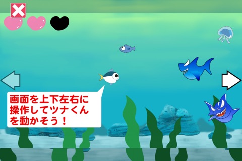 画面右から現れる他の魚たちに当たれば左上のハートが減るよ!