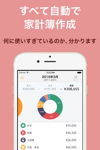 支出は費目別に自動でグラフ化されるので、お金の流れがひと目でわかります。