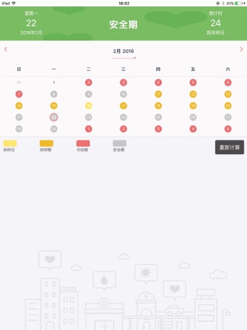 排卵日历是一个可以计算排卵期和安全期的小应用。您通过输入上一次月经时间、持续时间和平均周期,就能以日历形式直观的获得预测的排卵期和安全期,还可以显示您今天的状态以及排卵日倒计时,帮助您在排卵期提高受孕几率,避孕者亦可确定安全期,减少怀孕几率。