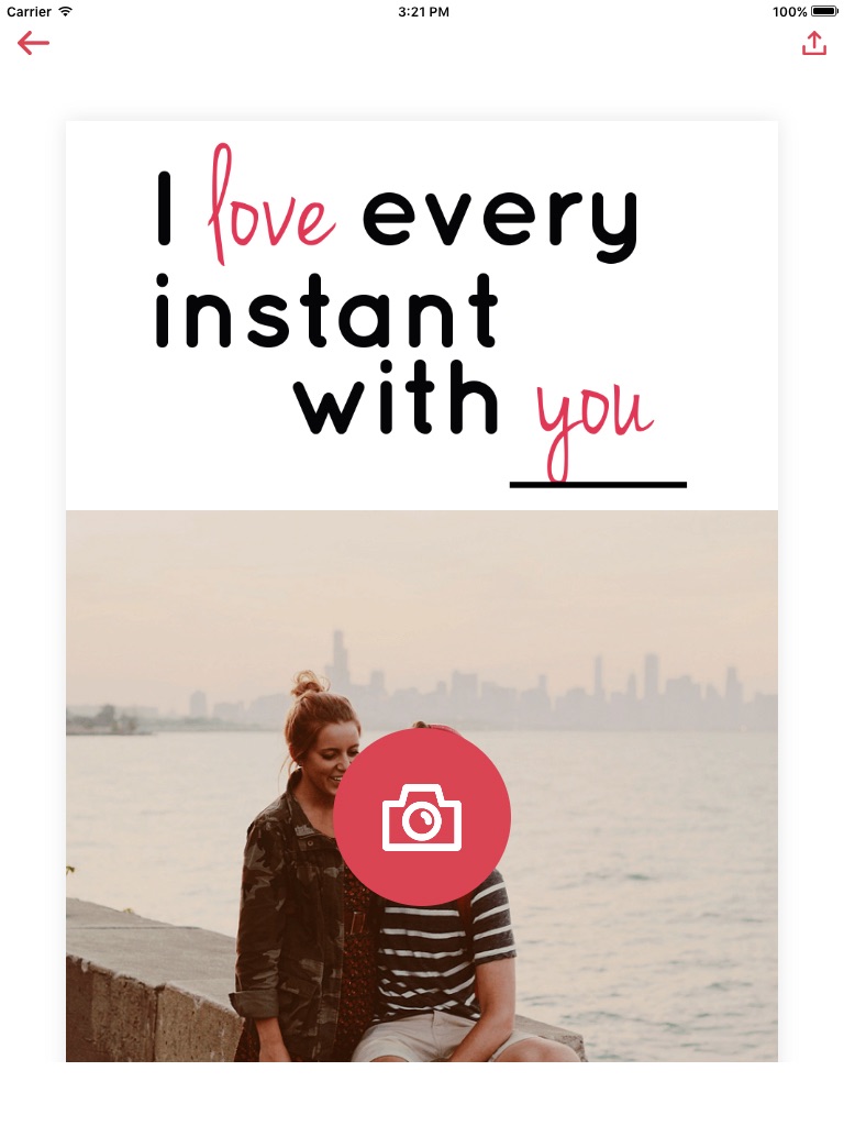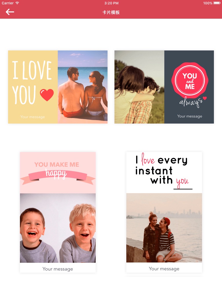 你可以很容易将照片放入喜欢的素材中,添加文字祝福,支持短信、邮件、微博、微信分享给好友,同时支持高清保存,发送图像到例如Instagram、Facebook、Twitter等应用程序。