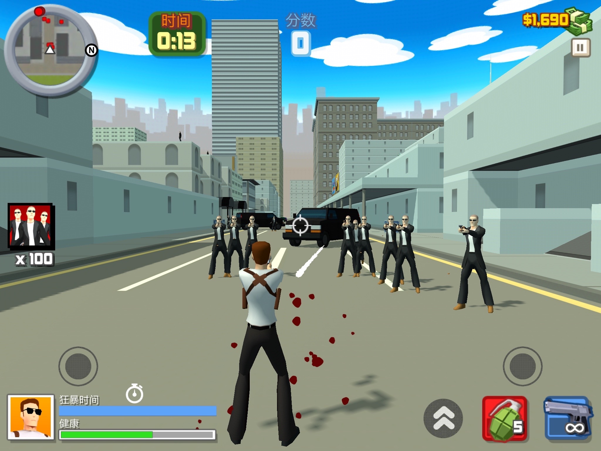 这是一款非常有趣的射击游戏,您需要控制主角,干掉对抗您的黑帮势力,成为城市的地下领导者!游戏采用了卡通风格,打击感突出,画面绚丽,场面非常火爆,您能看到了东西,全部都可以被破坏掉,连大楼都可以炸塌!