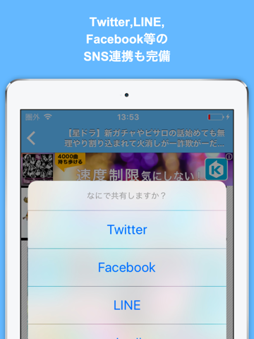 Twitter, Facebook, LINE等のソーシャル連携も万全!どんどんシェアしよう!