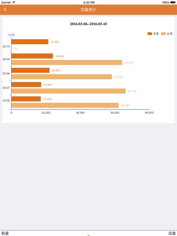 ¤货量统计---可查询5天或5个月的进出港总货量,随时随地展现进出港总货量。