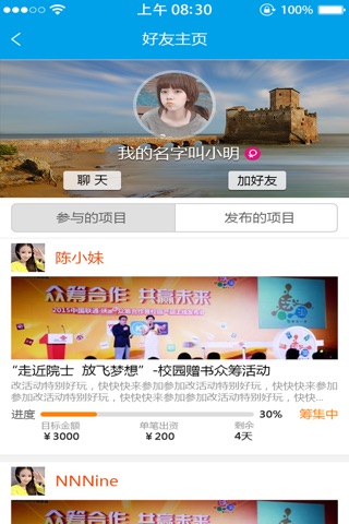 3.聊天功能:参与项目者之间通过聊天功能进行沟通交流。发起者也可以通过聊天功能把重要事项通知给参与者;