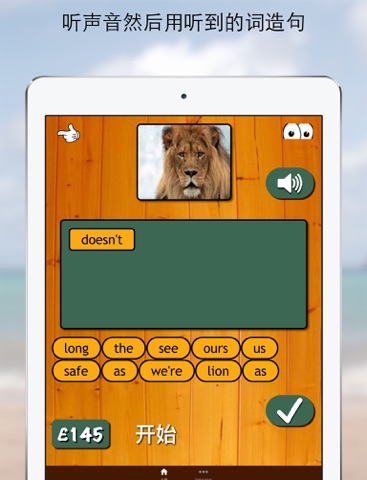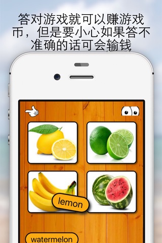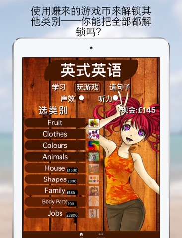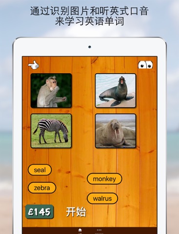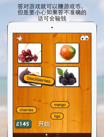 通过玩配对游戏,把图片和单词配对来学习英语。点击的单词都有英式英语配音。每次答对准确的单词会得到游戏币,这些钱可以把其他的类别解锁。但是要小心因为每个不准确的答案会让你输钱。