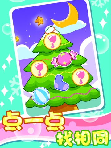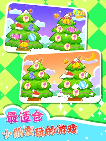 圣诞树上挂着各种神秘的圣诞礼物,需要靠宝宝的记忆连续翻开两个相同的礼物才能获得礼物,获得当前关卡所有礼物便可以过关了。