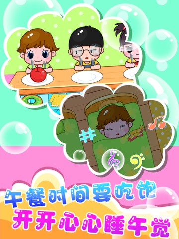 怎样才能让宝宝了解到幼儿园的乐趣之处,克服学前恐惧呢?开心幼儿园模拟宝宝在幼儿园的一天:学知识,吃午饭,睡午觉,玩玩具,做运动。