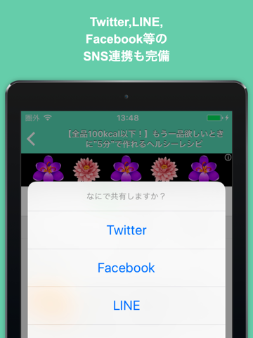 Twitter, Facebook, LINE等のソーシャル連携も万全!どんどんシェアしよう!