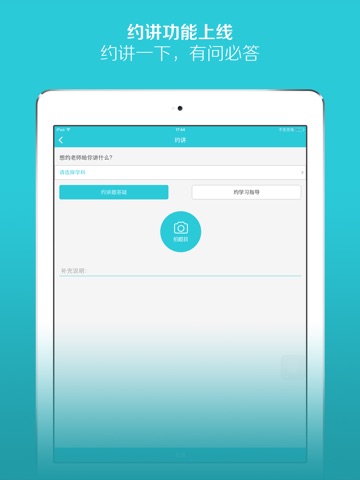 最新约讲功能(智能学习问答交流),是针对高考生在学习、做作业中遇到的难题、难懂知识点等可以老师、学霸、过来人提问,拍照试题提问,好老师亦可以微视频的方式解答、答疑、互动交流、答案解析、知识拓展延伸,让学生更深一步的掌握知识技能。快速知识问答,将难点消灭,突破弱科,高效提分。