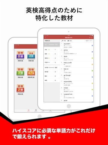 英検英単語対策の決定版!完全無料でご利用頂ける!英検突破する単語力の養成を、効率よくサポートすることをお約束いたします。英検5級・4級・3級・準2級・2級のレベルごとに、合格に必要な英単語4800語収録。