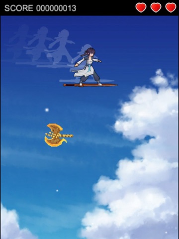 点击屏幕,操纵飞剑上下移动躲开飞来的兵器,你有3个生命,可以通过获得红心回复生命值。