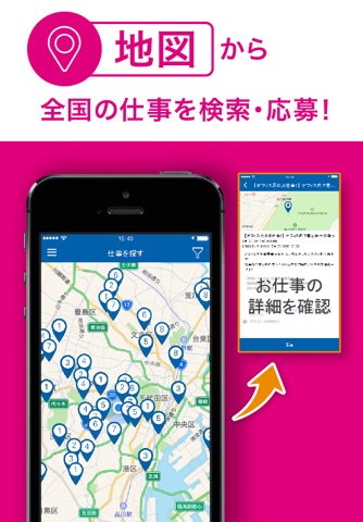 GPSを利用して、現在地周辺からお仕事を探せます。また自宅近くなど、自分の行動範囲内にある求人情報もカンタンに検索可能。日付やキーワードでの絞り込み検索機能も有り。