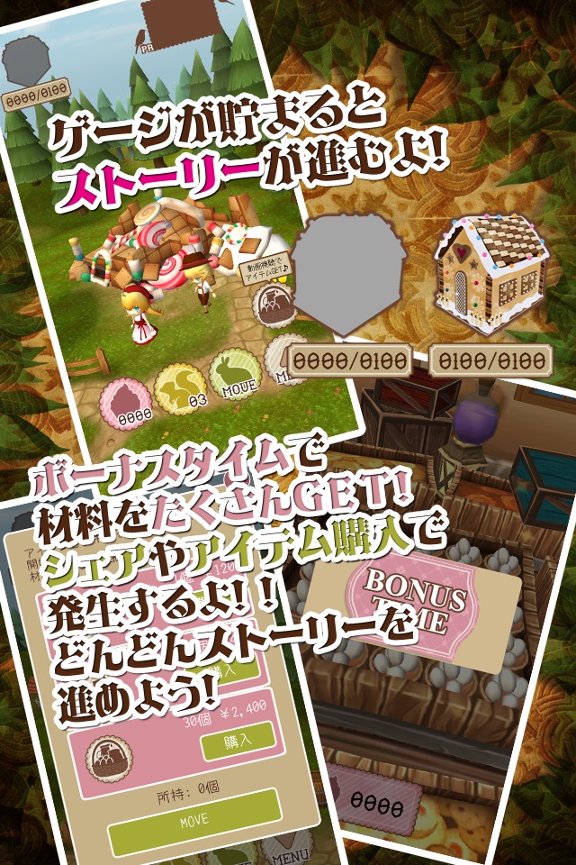 ・「ゲーム画面(お菓子の家)」と「収集画面(お店)」の見やすい二画面構成です。