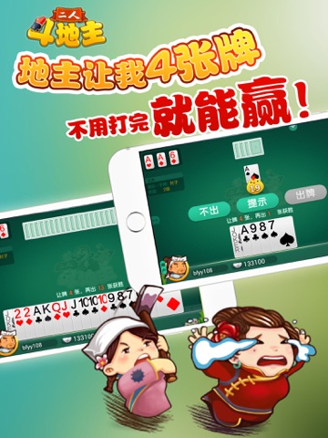 二人斗地主是由游戏茶苑(www.gametea.com)自主独立开发的与PC二人斗地主互通的二人斗地主牌类游戏。规则为2人每人发17张牌,3张牌为底牌,其余牌为弃牌。首次随机选玩家先抢地主,抢地主期间,一名玩家不抢地主,则另一方直接为地主;若双方都抢了三次地主,那么先抢地主的玩家为地主,另一方为农民。如果抢地主三次,农民房可以被让牌4张,即农民只要出13张即可获胜,地主需要出完全部的牌才能获胜。茶苑二人斗地主包体小,流量花费少,轻松安装,一键游戏,是游戏茶苑2016年新作品,受到了很多玩家的喜爱。