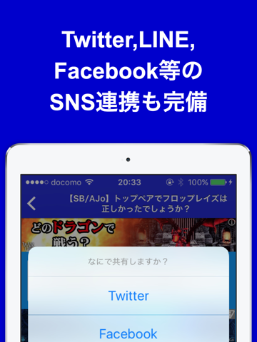 Twitter, Facebook, LINE等のソーシャル連携も万全!どんどんシェアしよう!