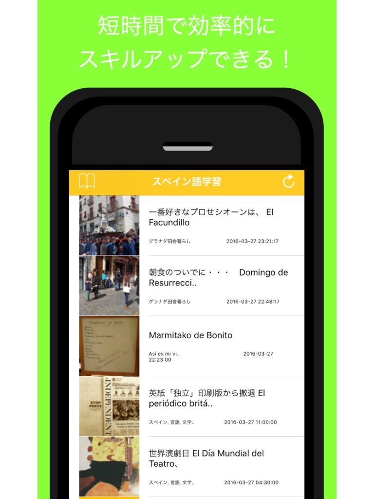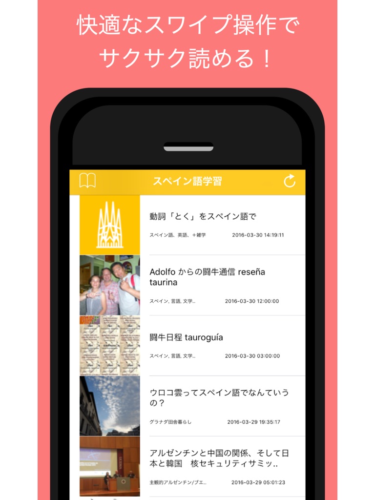 シンプルでわかりやすいUIと簡単操作でサクサク読めるスペイン語学習に特化した無料の学習アプリです。