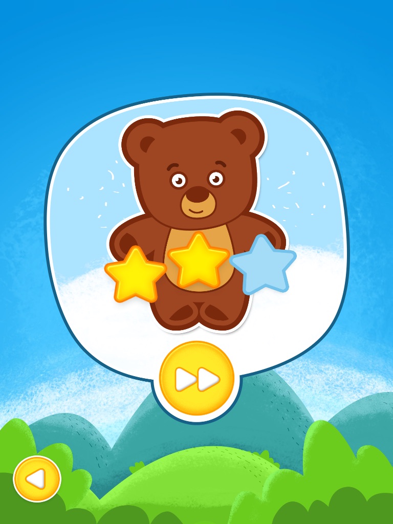 If child did all correct, the level is finished and in case, child got enough scores, next level will be opened. To get the third star, child has to play the level again.