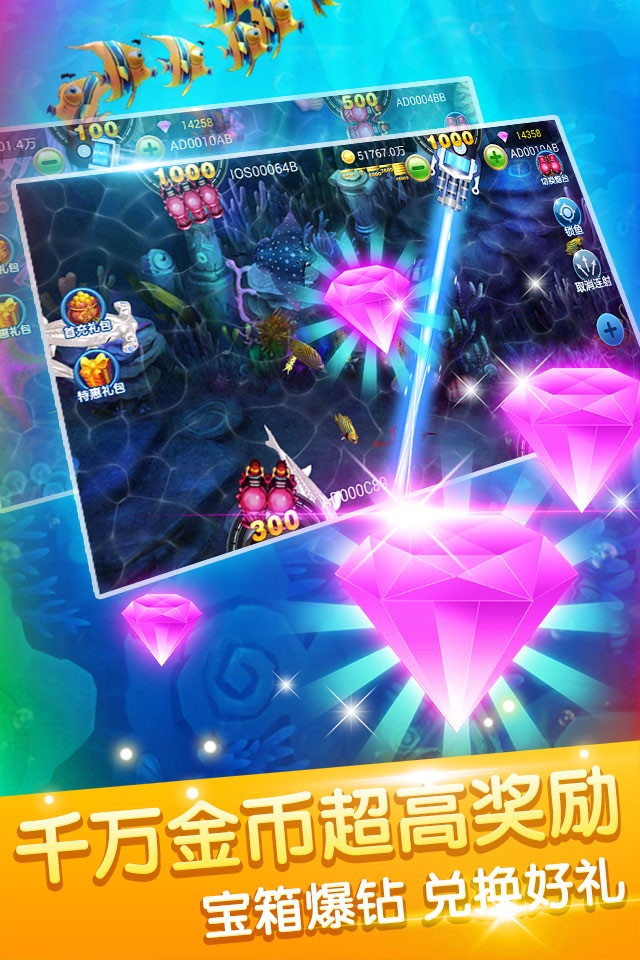 3.街机捕鱼玩法的全新升级,游戏内容更加丰富,爆机模式、精准锁定、自动射击,躺着也能赚金币!
