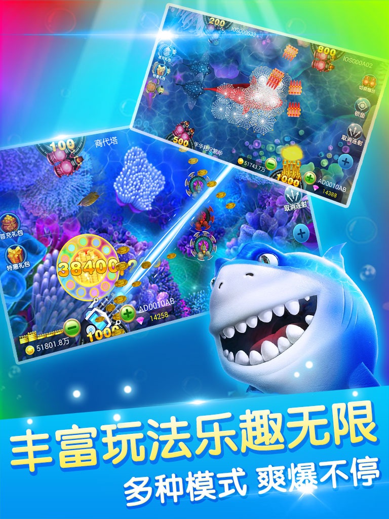 2.百倍金鲨、震撼BOSS、爆钻宝箱,多种特色炮台助你一网打尽!