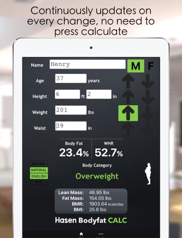 - Automatically updates results as you type! No need to press a calculate button each time like with other body fat calculator apps