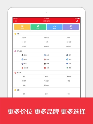 1、精准搜索你想要的汽车,可根据车型、价格、品牌等多种条件筛选。