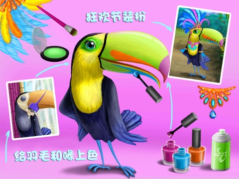 热带动物们喜欢不断地变换造型!这里有热情的树懒哥哥,优雅的猎豹妹妹,还有高高高的长颈鹿弟弟,快来为它们的毛皮上色,修剪,清洗和做造型吧。成为丛林中最时尚的造型师,为热带动物们设计最潮的服饰 。如果你可爱的顾客们渴了,你还能给它们调制一杯special热带果汁!