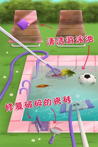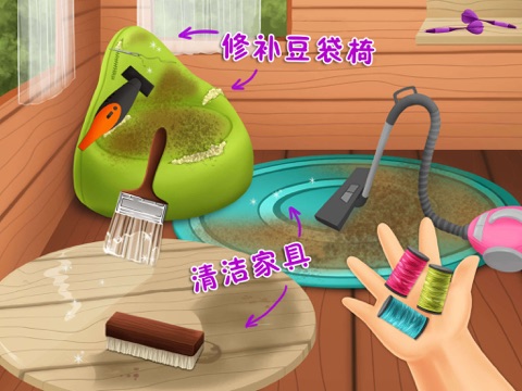 房间已经一团乱啦!厨房里的脏盘子,没有洗的衣服,坏掉的栅栏,乱糟糟的马厩,脏兮兮的游泳池,黏糊糊的地板,布满灰尘的桌子和其他一堆需要收拾打扫的东西。快开始行动,把房子重新打扫的干干净净吧!