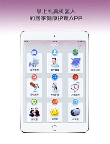 掌上礼宾-护士端是一款基于机器人的居家健康护理APP,主要功能有任务管理、客户管理、聊天记录、基础服务、专业护理、其他服务、朋友圈、会员日、微视频和会员中心等