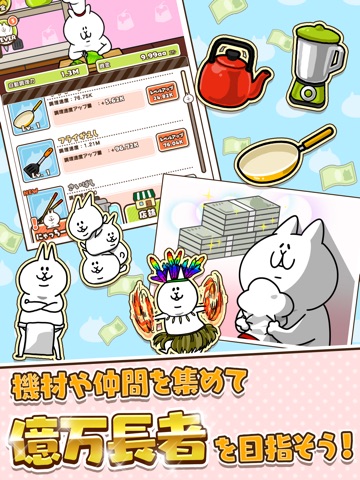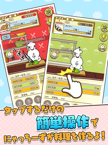 ゲームはタップしか使わない超簡単操作。放置していてもにゃっちーずは料理を作り続けるから、とっても気楽に遊べちゃう、暇つぶしに超最適!