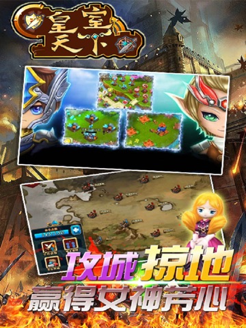 《皇室天下》是一款大型的3D策略游戏,游戏结合了三国志系列的策略要素和暗黑破坏神系列的动作RPG要素,绝对会让你眼前一亮,Q萌的任务造型、精心设计的角色换装系统、华丽炫酷的人物技能、更有不同属性的套装等你发现。同时,游戏为你带来了600名大规模的作战,想想都觉得不得了,如此辉煌的战斗,你怎能缺席?对了,还有女神哦!英雄,我们在游戏中等着你哦!除了“COC”,我们还可以一起《全民攻城》!!!
