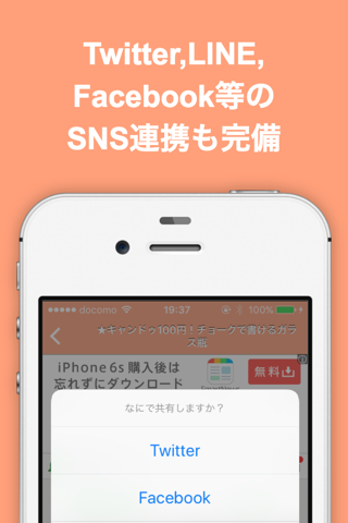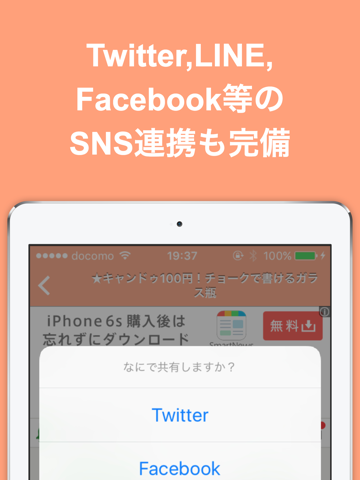 Twitter, Facebook, LINE等のソーシャル連携も万全!どんどんシェアしよう!