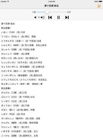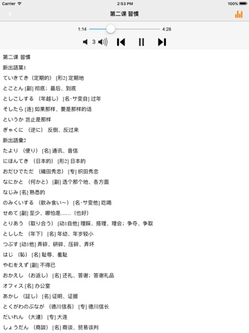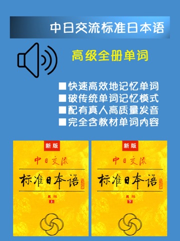 本应用为《新版中日交流标准日本语》单词学习软件。它包括高级上下册共24课全部单词内容,全程真人高音质发音。