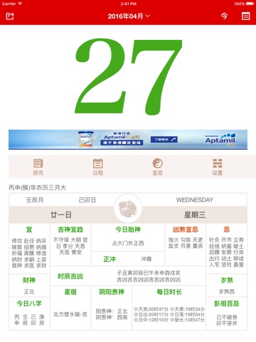 每日黄历新闻,黄历是在中国农历基础上产生出来的,带有每日吉凶的一种历法,每日出行必备,更增加头条新闻,重要头条让你不会错过。黄历相传是由轩辕黄帝创制,故称为黄历。该应用为您提供二十四节气的日期表,每天的吉凶宜忌、干支、星宿、月相等。