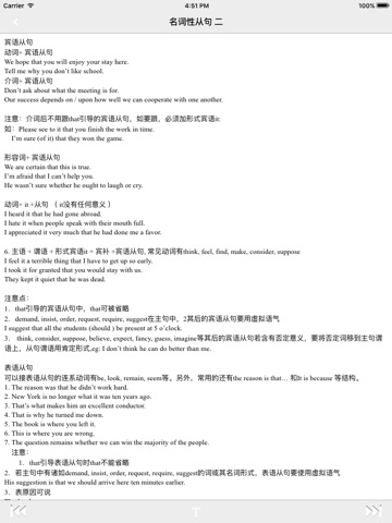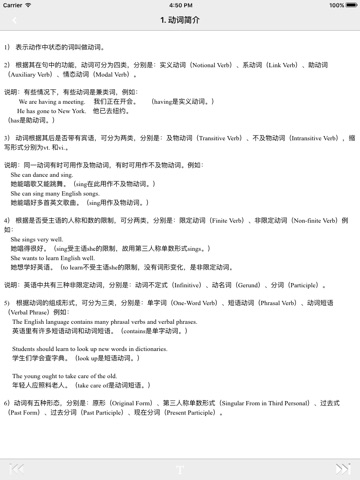 应用结构清晰合理、内容丰富有趣,简洁宏观地阐述语法的架构,且针对语法中的重难点作深刻剖析,清晰地讲解英语中常用的动词、名词、形容词、副词等9大词类,名词性从句、定语从句、状语从句等各种从句,非谓语动词、虚拟语气等各种用法。