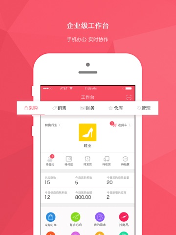 【工作台】按员工工作角色划分采购、销售、财务、仓库、管理五大功能模块,智能筛选显示功能模块、待办工作、关键数据和常用工具,让工作更轻松和高效。