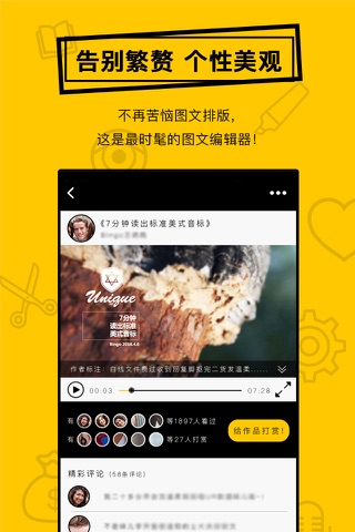 颠覆传统的生活分享方式,抛弃单图文单语音繁复的枯燥模式,快速生成短小又精湛、有料又有趣的个性图文或者微课,分享你学习&生活&工作的精彩点滴,还有机会获得朋友打赏哦!