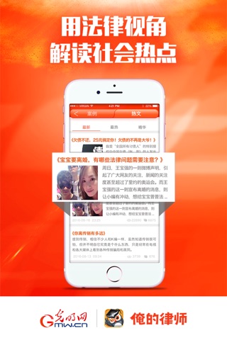 『俺的律师』是由国家权威媒体光明日报、光明网、法制日报、法制文萃报倾力打造的法律服务平台,为百姓享受律师服务提供解决方案,聚合国内海量实名认证律师,借助《法治进行时》大型律师真人秀节目推广,提供离婚纠纷、侵权赔偿、债权债务、房产纠纷、劳动仲裁、知识产权、交通事故、遗产继承、医患纠纷、民事刑事、公司事务等各类案件的免费咨询和法律服务。