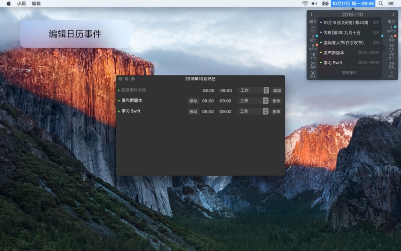 > 小历是 macOS & iOS 平台上面小而美的日历,macOS 上面通过菜单栏和通知中心让用户查看日历十分便捷,希望能通过简洁的设计带给用户最方便的体验