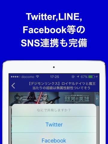 Twitter, Facebook, LINE等のソーシャル連携も万全!どんどんシェアしよう!