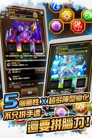挑戰你的反應與策略思考!技能就靠排列旗子來發動,爽快排列讓人欲罷不能!戰鬥畫面中央會有 6×5 共 30 顆棋子,若將棋子排列成 U 字形、十字形等形狀,就可以讓自己隊伍中相對應的角色發動特殊能力唷!
