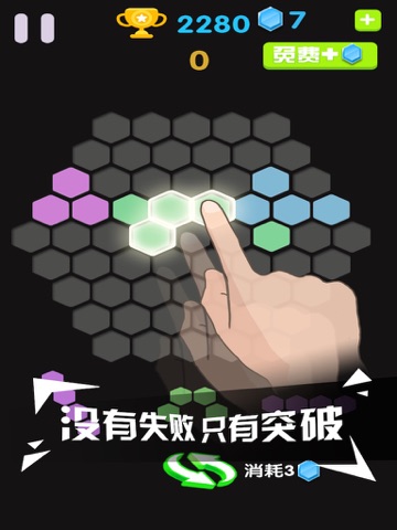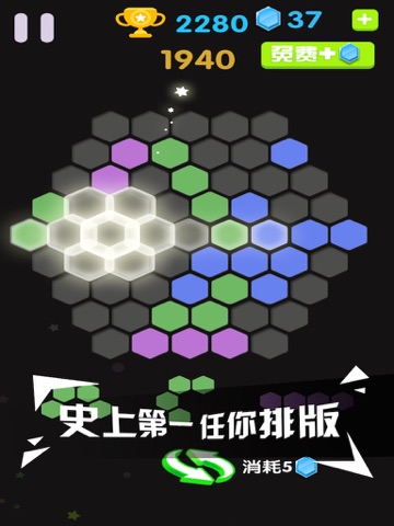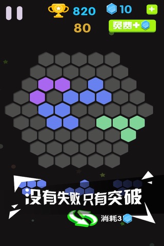 Hexagon to eliminate the main game interface is a big chessboard, each randomly appear in the 3 box, drag one blank is positioned on a chessboard, which are arranged in a complete one or more lines can be realized to eliminate the six angle score, when the board cannot put down any box combination, game the end.