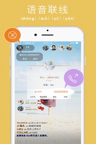 [语音联线] 直播过程中,主播作为主叫可以指定被叫观众,发起语音连线进行VoIP语音通话,其它观众倾听的同时、依然可以通过语音弹幕说出你的声音