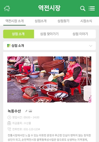 각 점포별 소개 및 간판사진,연락처(전화걸기),판매물품 등을 볼 수 있고,