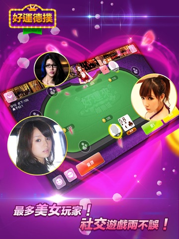 聚集了全世界的撲克粉絲,街機達人捕魚高手也愛玩,各國好友匯聚德州撲克牌室打牌聊天。100% 免費玩,免費贈送籌碼,每天還有紅包獎勵,朋友可以相互送禮,全民一起天天開心玩德州撲克!